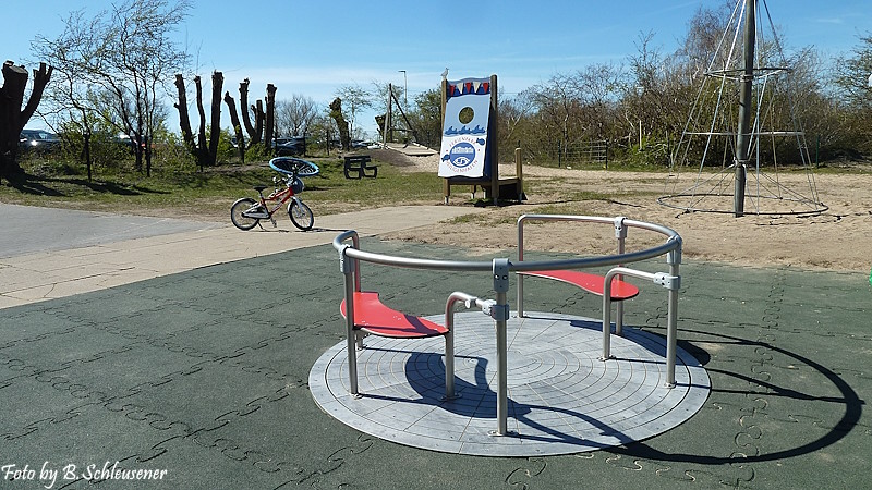 So befindet sich am großen Spielplatz eine Sitzkombination, die es auch einem Rollstuhlfahrer ermöglicht, dort Platz zu nehmen.